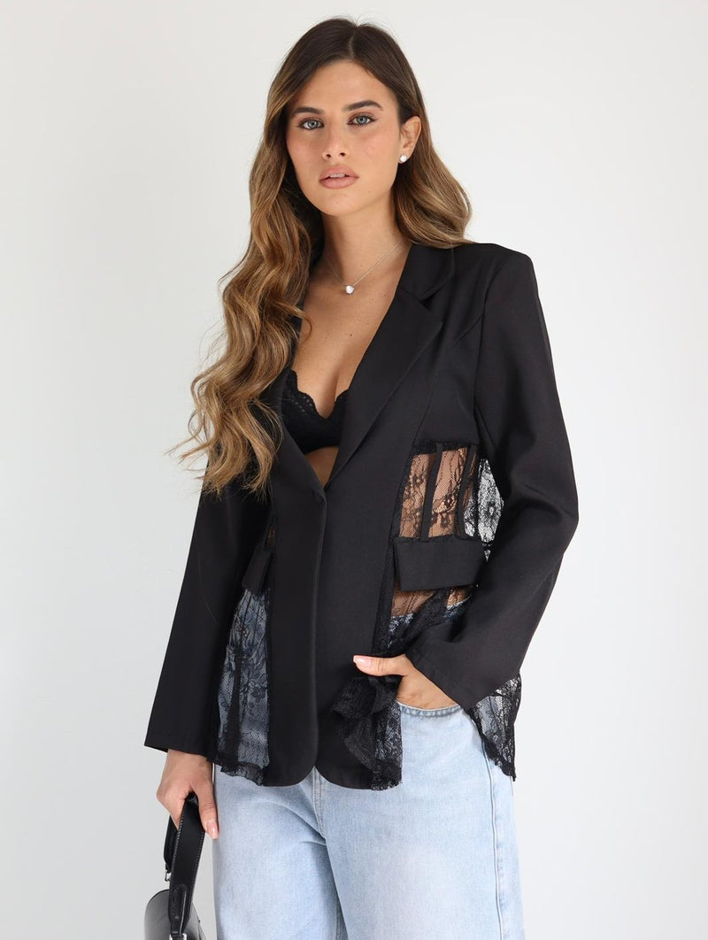 בלייזר Tami בגזרה מחויטת עם שילוב תחרה עדין בצדדים. אלגנטי, נשי ומשדרג כל לוק יום או ערב.