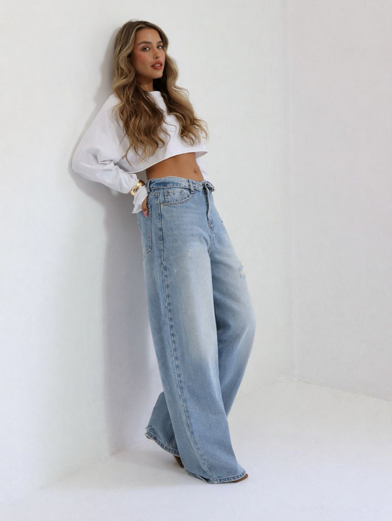 ג׳ינס Amor בגזרה היסטרית רחבה ומדויקת עם שטיפת דנים בהירה וטרנדית.