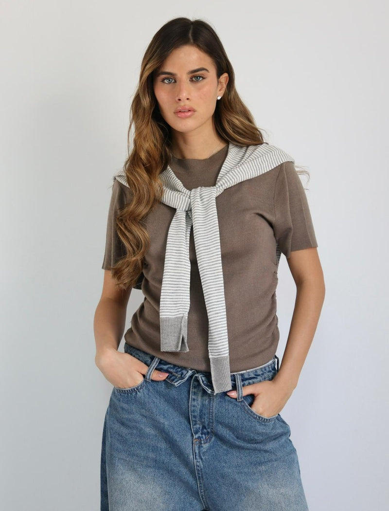 טי שירט עם עליונית בגזרה מדויקת ומחמיאה עם שרוול קצר ובד רך ונעים. בסיס מושלם לכל לוק יומיומי או אלגנטי.