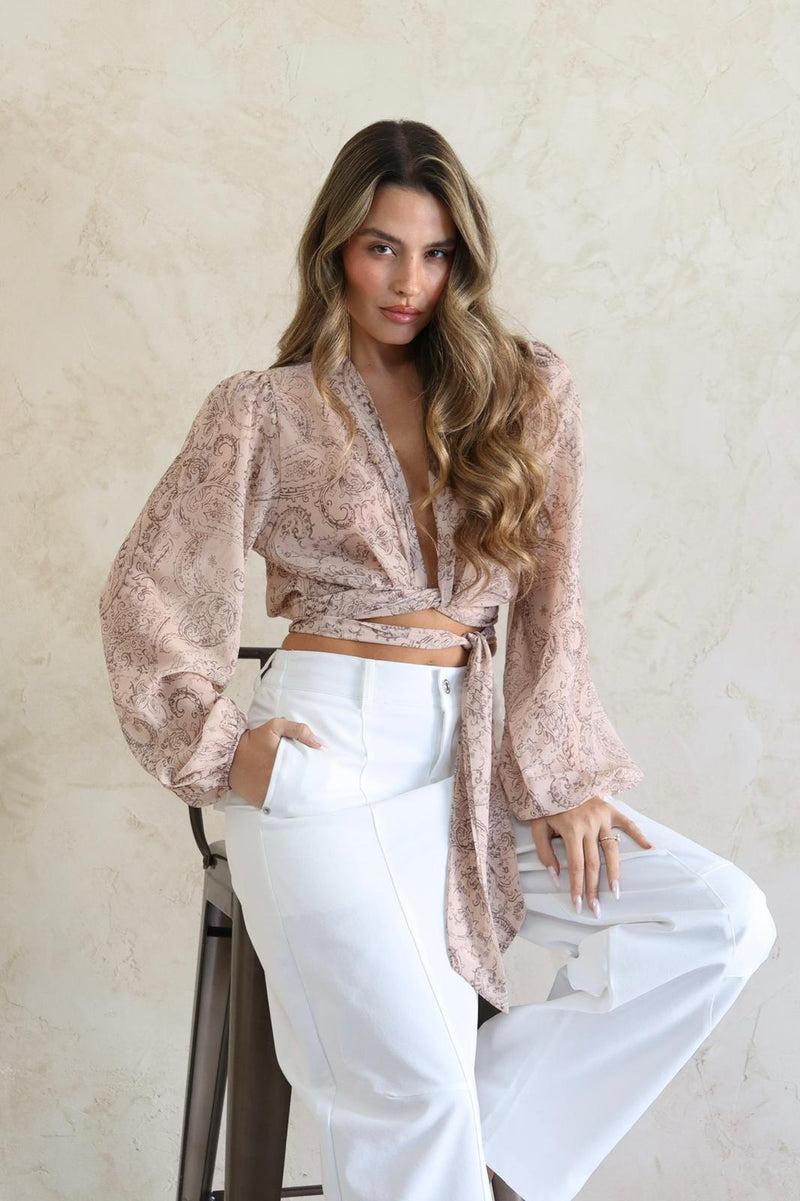חולצה עם קשירה קדמית והדפס עדין בגזרה מחמיאה.