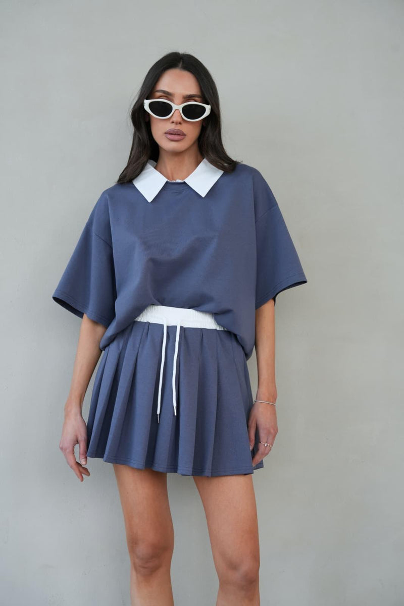 חליפת Hailey היא סט אופנתי הכולל חולצה בגזרה רחבה עם צווארון קלאסי וחצאית פליסה קצרה עם גומי ושרוך במותן.